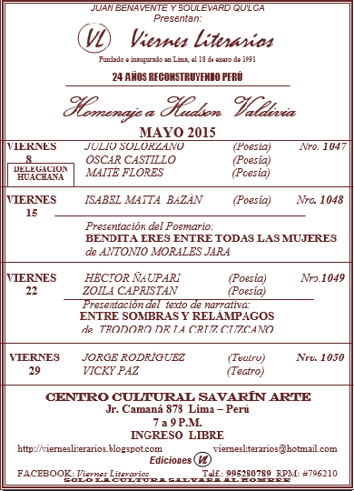 Viernes Literarios busca difundir todas las manifestaciones artísticas desde la poesía, la narrativa, hasta la dramaturgia. Estos eventos se realizan todos los viernes a las 7 p.m. en el Auditorio del Centro Cultural “Salvarin Arte” (Jr. Camaná 878 Lima-Perú). El ingreso a todas las actividades es libre.