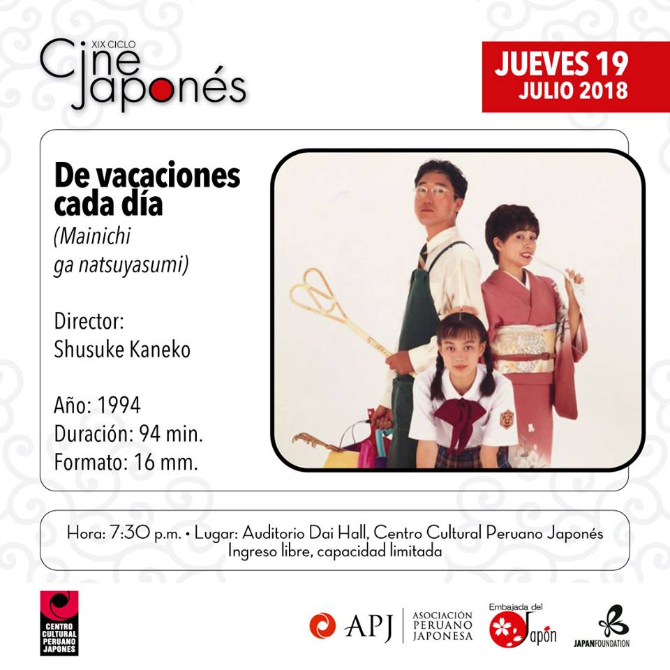 En esta ocasión, el XIX Ciclo de Cine Japonés continúa con la proyección de De vacaciones cada día, del director Shusuke Kaneko. El filme cuenta la historia de los Rinkaiji una familia admirada en su vecindad. Nariyuki, el padrastro, trabaja en una corporación de élite y Sugina, la hija, estudia en una de las mejores escuelas de Tokio. Estos hechos dan a Yoshiko, la esposa, cierto estatus entre sus amistades.