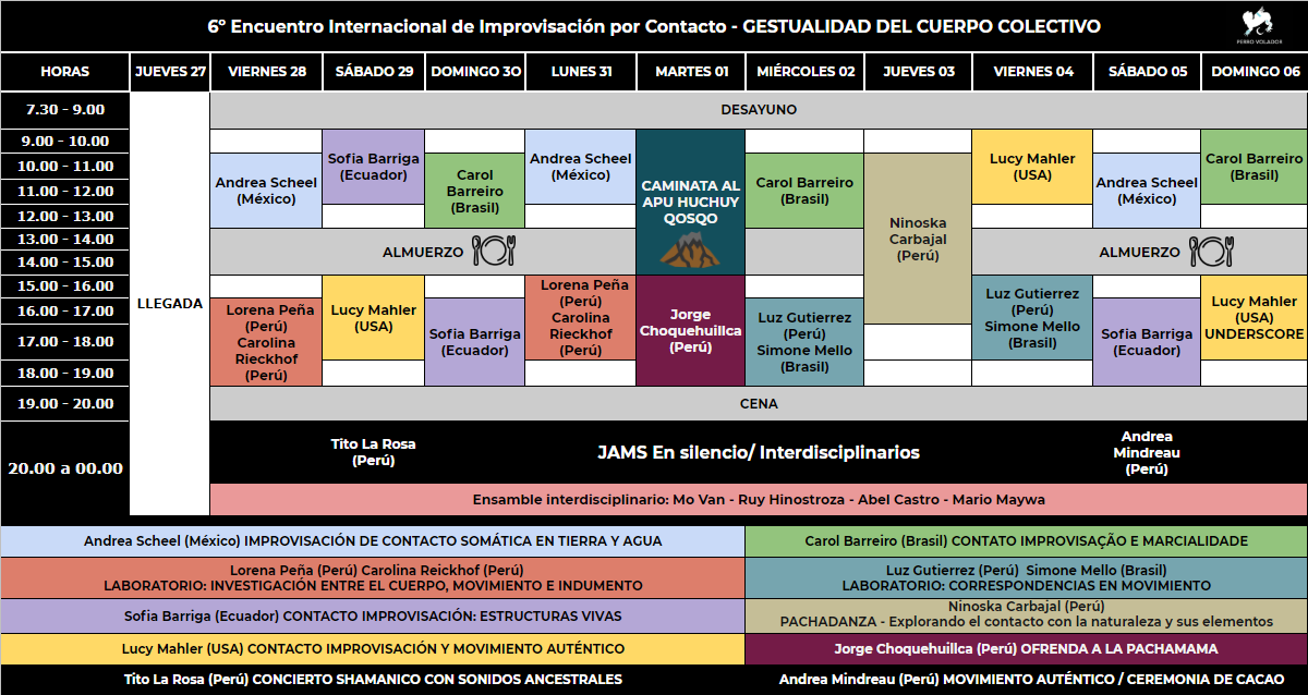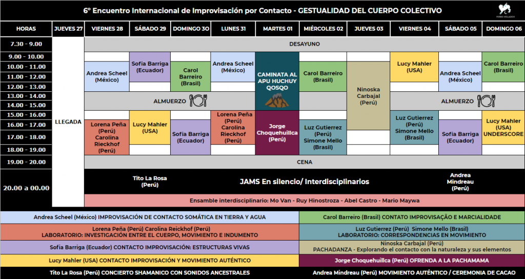 Diseñado para albergar, dentro de un marco de intercambio artístico pedagógico, a 16 artistas nacionales e internacionales invitados a compartir sus prácticas y experiencias con los participantes, a través de talleres, presentaciones y conversatorios en relación a la Danza Contemporánea, la práctica del Contacto Improvisación como lenguaje integrador en el colectivo y su aplicación en el desarrollo de las artes escénicas y en el territorio de las relaciones humanas. Propiciando espacios de intercambio y desarrollo de herramientas que permitan fortalecer y dar continuidad a las investigaciones de la creación artística contemporánea, además de la revaloración del concepto andino AYNI (Intercambio y Reciprocidad) como herramienta de desarrollo y práctica orientada al bien común.