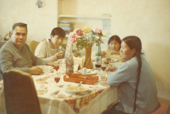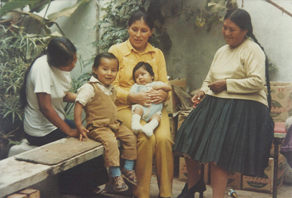 Foto 1: ‘La familia, un motivo para celebrar’. (1971). Fotógrafo: Roberto Tito Tito. Personajes de izquierda a derecha: Timoteo Tito Taco, Marcial Tito Tito, Nelly Tito Tito, Pascuala Tito Quispe. Lugar: Se tomó en el comedor de su casa ubicada en La Victoria (Lima).