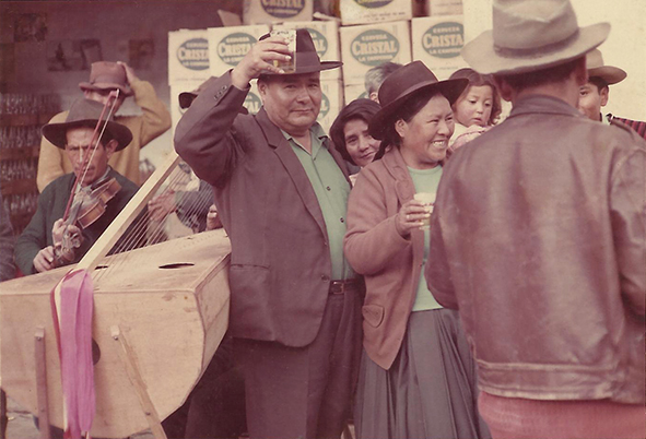 Foto 3: ‘Salud, compradre!’. (1972). Fotógrafo: Roberto Tito Tito. Personajes de izquierda a derecha: Violinista Marcacusco del distrito de Aucara, arpista Edmundo de Cabana Sur, Timoteo Tito Taco, Doña Gavina de Sarmiento, Pascuala Tito Quispe, Mocha Sarmiento(Monica), de espaldas: Luis Egocheaga.