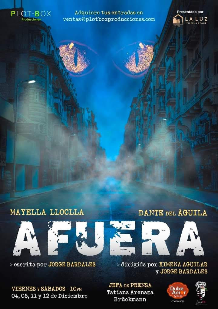 Suspenso y humor negro es lo que veremos en “Afuera”, obra/película escrita por Jorge Bardales y dirigida por la directora Ximena Aguilar y el mismo Jorge Bardales, quienes a raíz de la pandemia que aqueja el mundo entero y tras el cierre de teatros y el paro de producciones audiovisuales y la cancelación de eventos artísticos, utilizaron toda su imaginación para adaptarse a la nueva normalidad y poder seguir practicando su arte y llevar entretenimiento al público.
