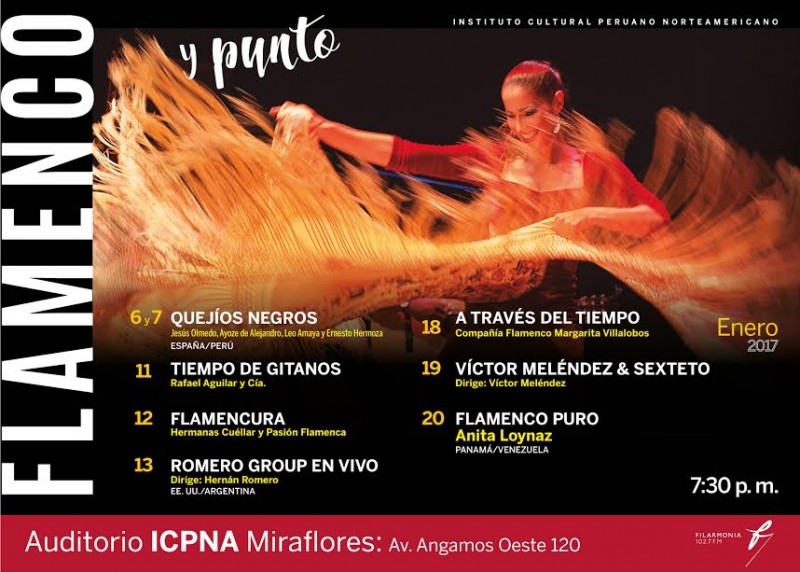 Actualmente, puede considerarse que el flamenco ha dejado deja de ser patrimonio exclusivo de España y Andalucía para convertirse en una manifestación cultural que ha ganado adeptos y cultores en muchas otras partes del globo. Prueba de ello es la permanencia que en nuestro medio tiene el Festival Flamenco y Punto, iniciativa del ICPNA que reúne a los más eximios cultivadores de este arte en el plano local y que también convoca a artistas de talla internacional. Este año empieza el baile y el canto con los españoles Jesús Olmedo y Ayoze de Alejandro, acompañados de los peruanos Leo Amaya y Ernesto Hermoza, quienes presentarán el espectáculo Quejíos negros, los días 6 y 7. Rafael Aguilar y su compañía se harán presentes el miércoles 11 con el espectáculo Tiempo de gitanos. El jueves 12 las hermanas Cuéllar y Pasión Flamenca nos deleitarán con Flamencura. El viernes 13 contaremos con la presencia de un invitado de lujo: el guitarrista argentino afincado en Estados Unidos Hernán Romero, ganador de un premio Grammy, nos presenta su Romero Group, y arrancará los más apasionados arpegios a su guitarra. A continuación, Margarita Villalobos y su compañía alegrarán la noche del miércoles 18 con A través del tiempo, espectáculo que nos narra las diferentes etapas por la que ha pasado el flamenco a lo largo de la historia. El jueves 19 tendremos en el escenario a Víctor Meléndez y su sexteto. Cerramos el festival por todo lo alto con Anita Loynaz, bailaora venezolana de corazón panameño que derrochará su talento en su espectáculo Flamenco puro, el viernes 20.