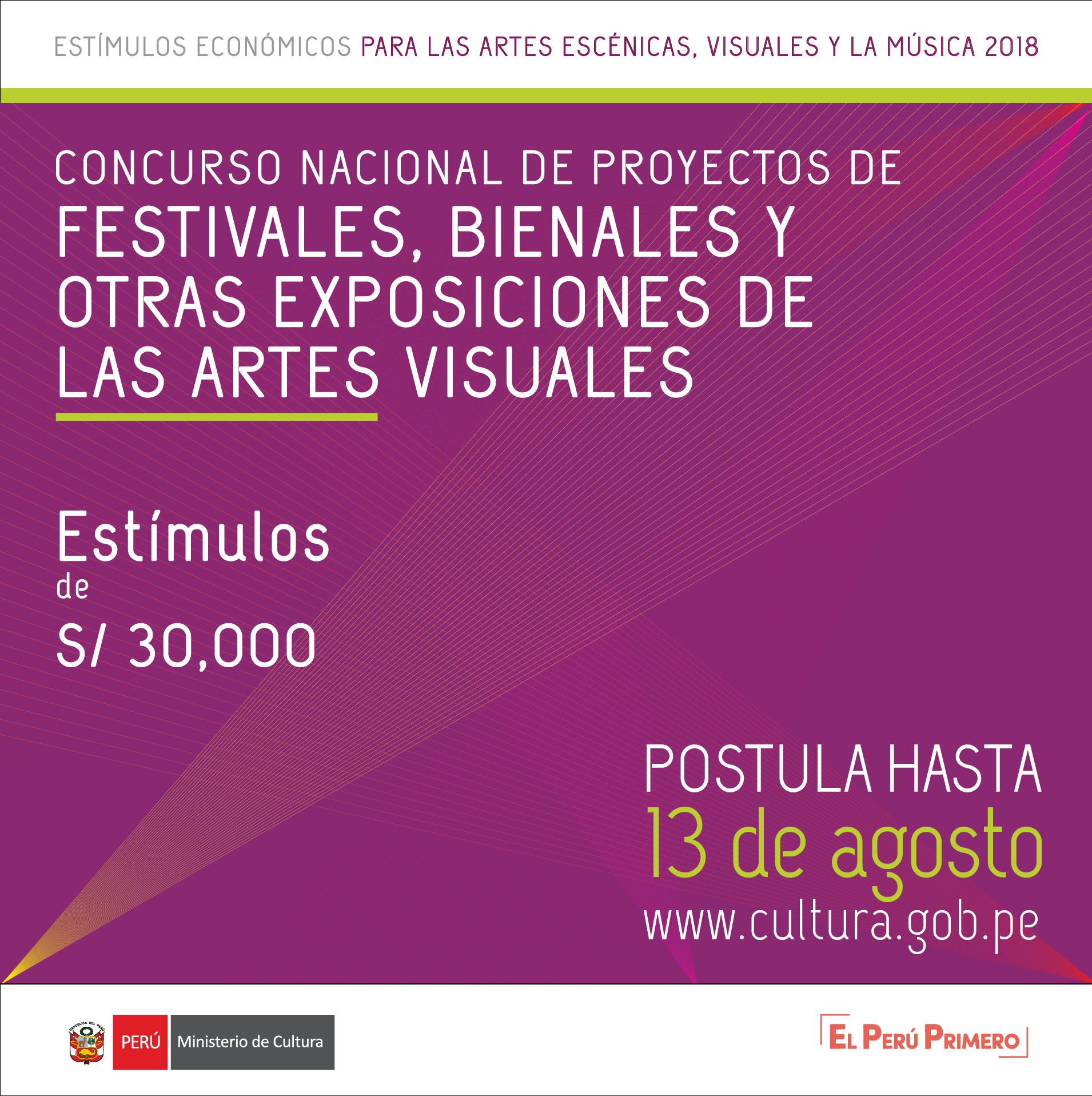 Postulación a través de mesa de partes del Ministerio y sus sedes desconcentradas. Estímulo económico de hasta 30,000 soles. Pueden postular personas jurídicas y naturales. Fecha límite de postulación hasta el 13 de agosto 2018
