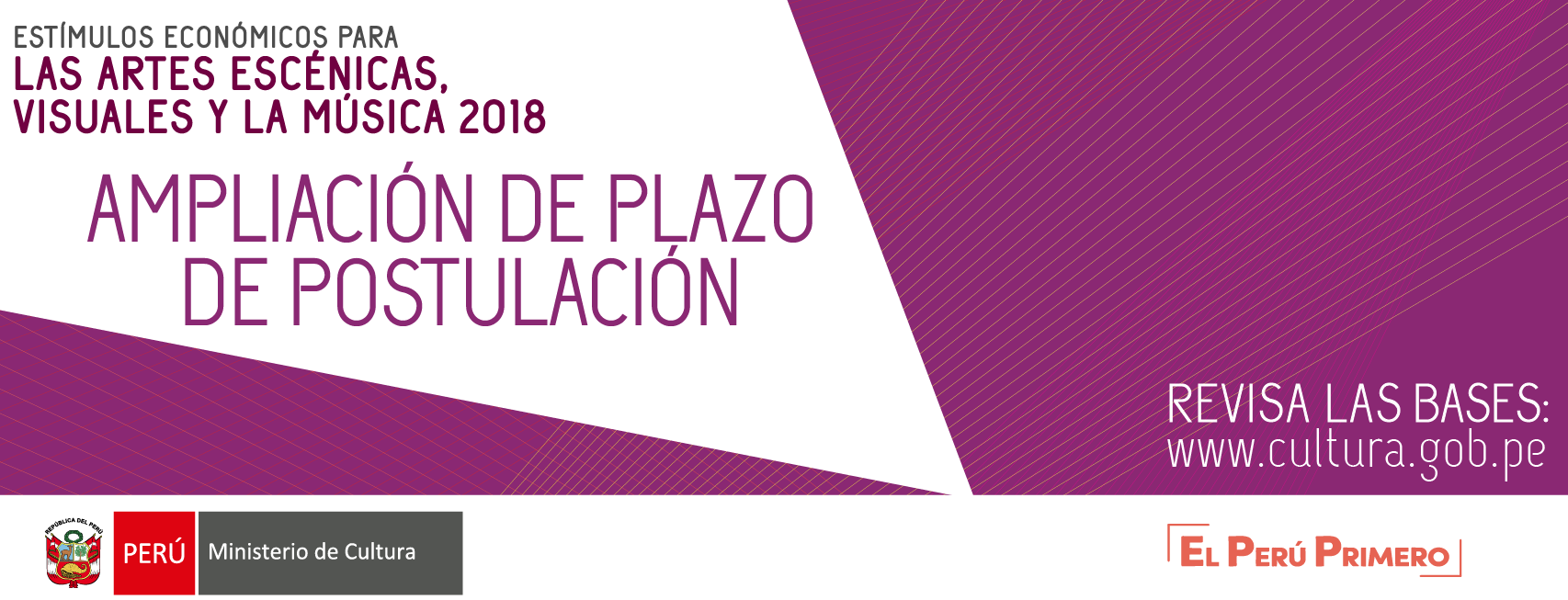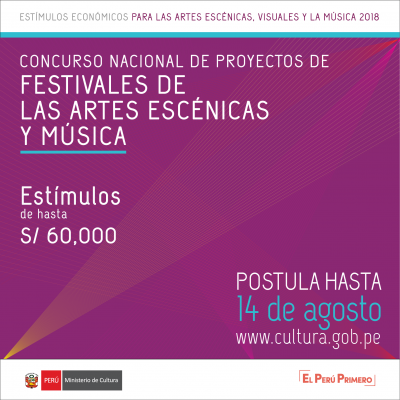 Sí aún no has postulado a los Concursos de los Estímulos Económicos para las Artes Escénicas, Artes Visuales y la Música, esta es una gran oportunidad para hacerlo. De acuerdo a la Resolución Directoral Nº 90135-2018-DGIA-VMPCIC/MC publicada hoy en el diario oficial El Peruano, sobre la modificación de cronogramas de los concursos, se indica que la fecha límite de presentación de postulaciones a los concursos se ha ampliado. Revisa las bases e inicia tu postulación hoy. Clíck aquí para más información