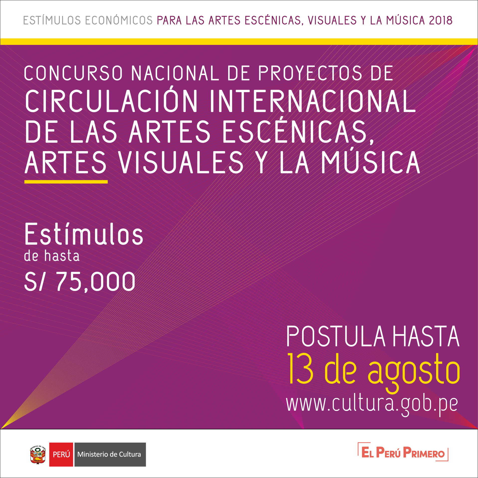 Solicitud a través del sistema virtual del Ministerio de Cultura. Estímulo económico de hasta 75,000 soles. Pueden postular personas jurídicas y naturales. 1era llamada a presentación de solicitudes: hasta el 13 de agosto 2018 (Para viajes a partir de octubre 2018)