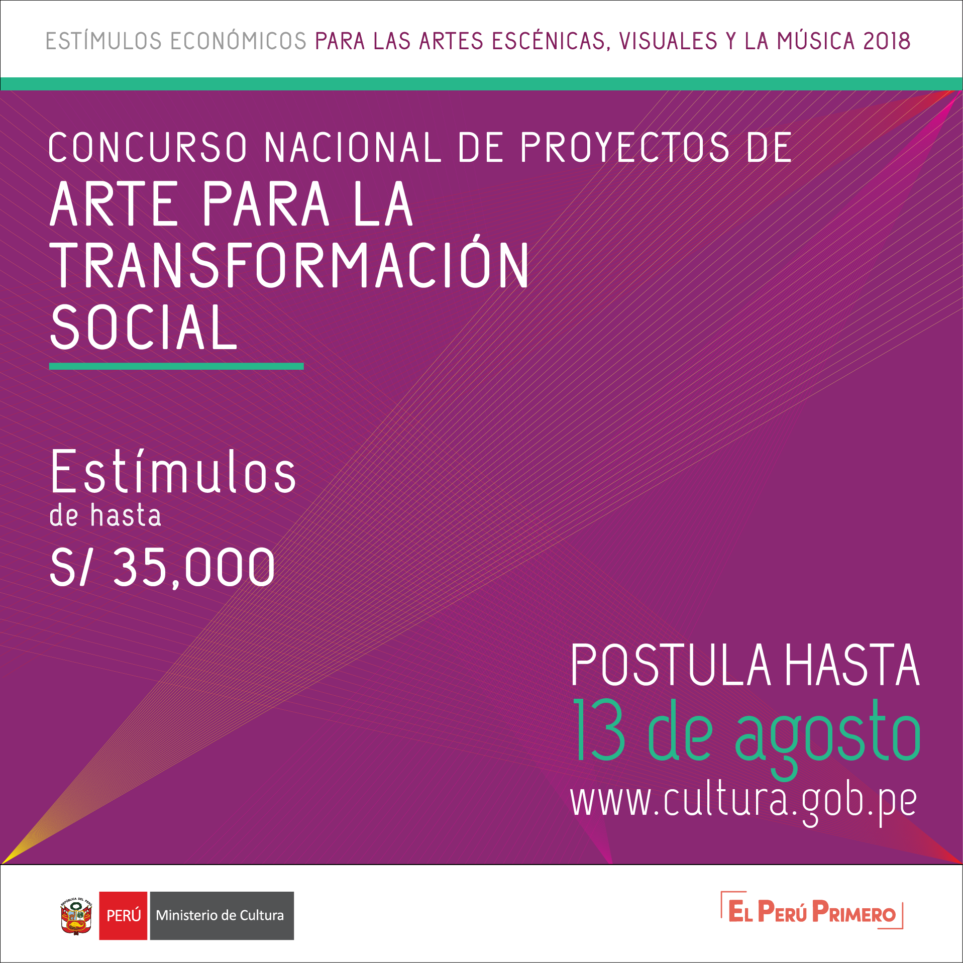 Postulación a través de mesa de partes del Ministerio y sus sedes desconcentradas. Estímulo económico de hasta 35,000 soles. Pueden postular personas jurídicas sin fines de lucro y personas naturales. Fecha límite de postulación hasta el 13 de agosto 2018