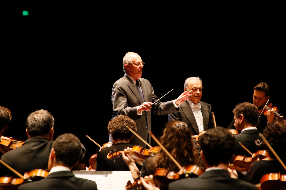 Kuczynski a la batuta -junto a Zubin Mehta- y la Orquesta Filarmónica de Israel interpretando el Himno Nacional del Perú en el Gran Teatro Nacional [Foto: Ministerio de Cultura]
