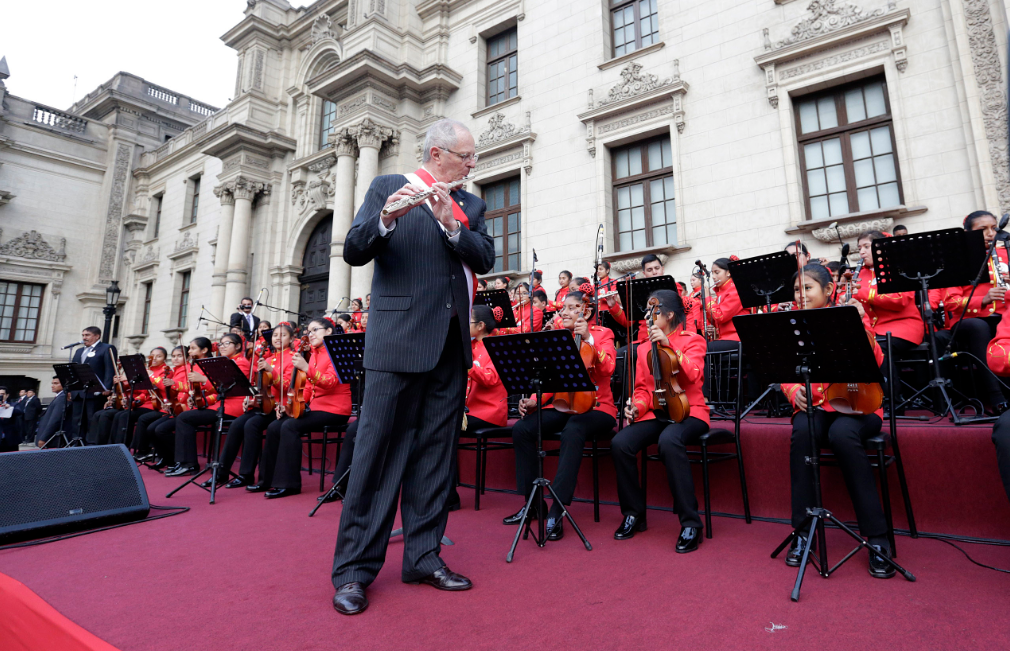 Kuczynski tocando con los niños de la Orquesta Sinfónica Juvenil de Manchay en el frontis de Palacio de Gobierno, durante la tarde del día de su juramentación. [Foto en: Camello Parlante]