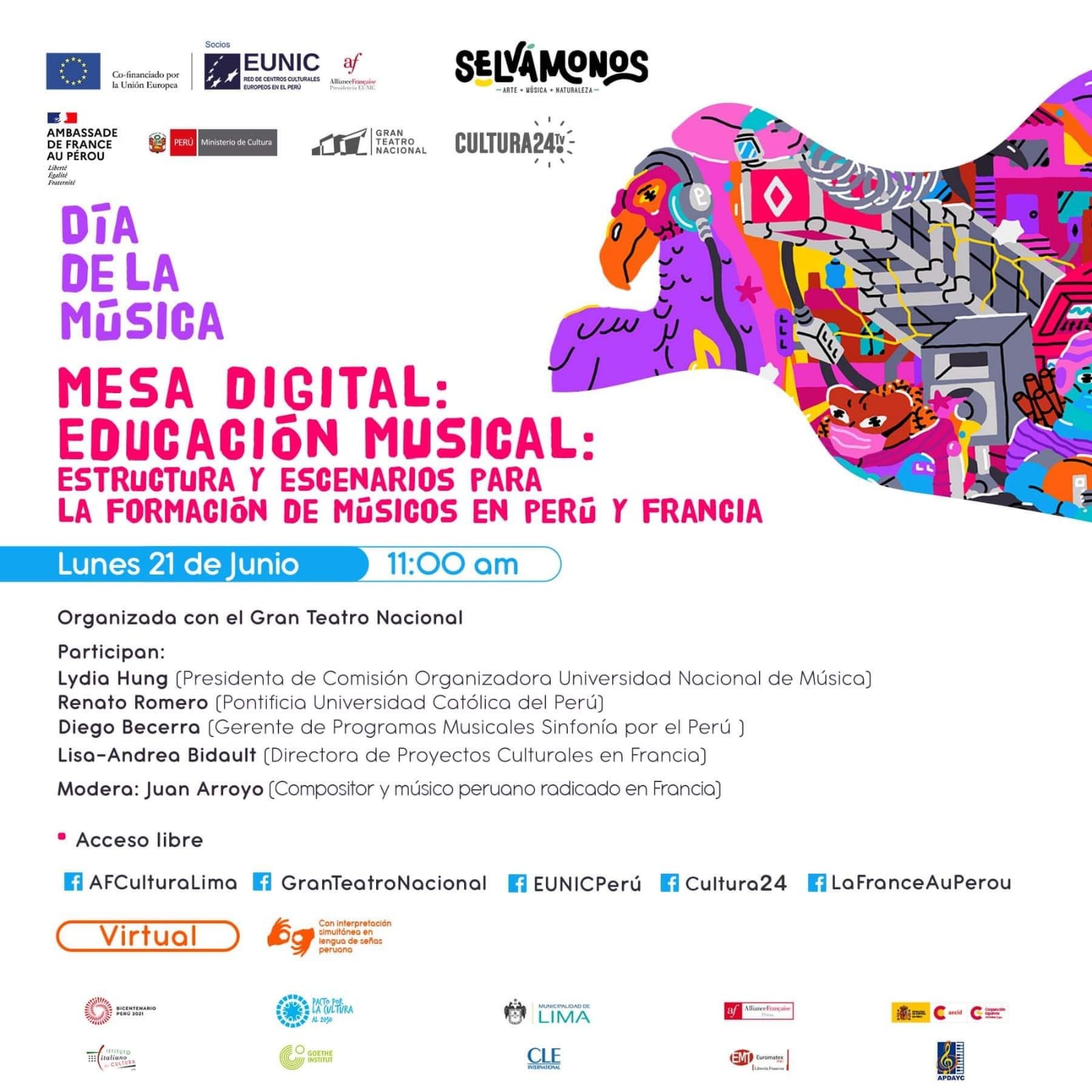 Este lunes, te invitamos a la Mesa Digital | Educación musical: Estructura y escenarios para la formación de músicos en Perú y Francia, organizada por la Ambassade de France au Pérou, el Gran Teatro Nacional y la Alianza Francesa de Lima.