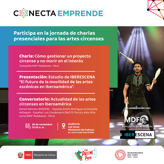 La Dirección de Artes del Ministerio de Cultura del Perú, organiza las siguientes charlas presenciales dirigido a los y las agentes culturales del sector de las artes escénicas y el circo en el marco del servicio Conecta y el Programa Iberescena, y el apoyo de la Compañía MDF Malabares, beneficiarios de Iberescena 2022-2023.
