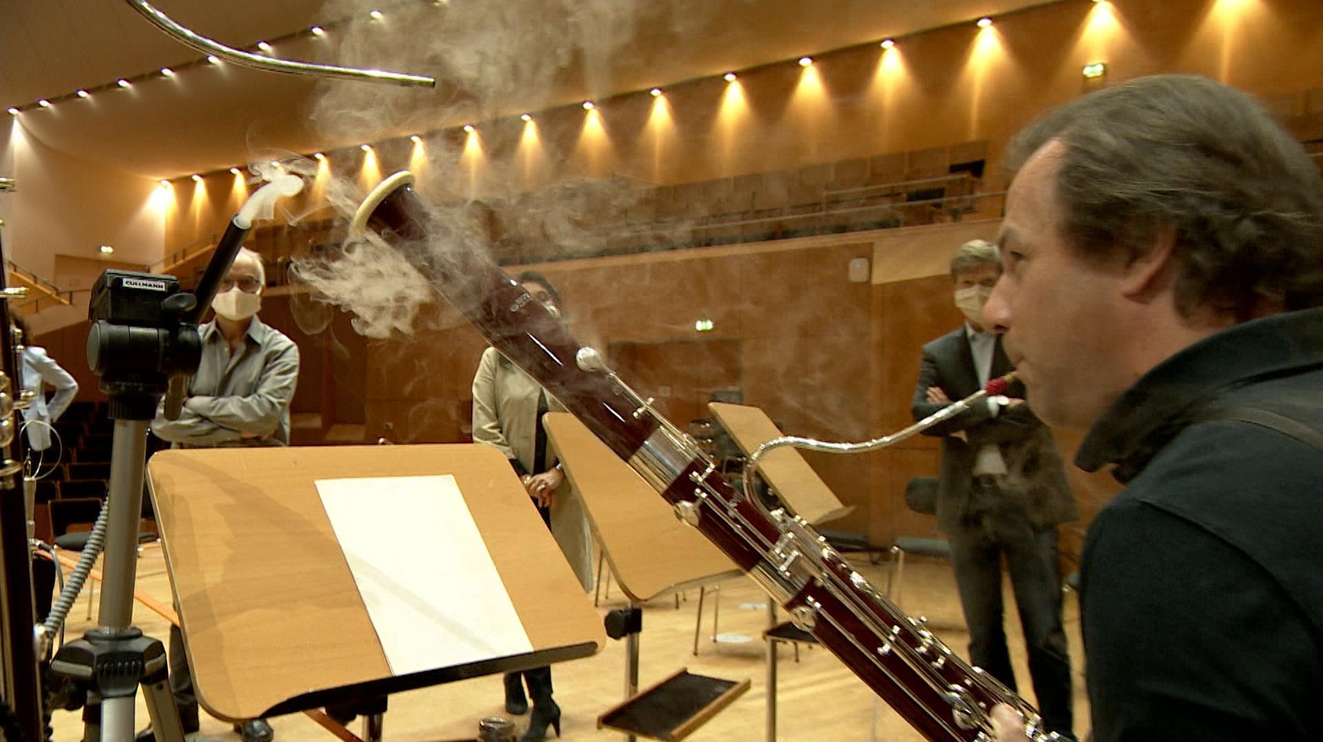 Músico de la Orquesta Sinfónica de Bamberg participando en la investigación de la propagación de aerosoles en instrumentos de viento. Estudio llevado a cabo por dicho elenco junto al Instituto de Medicina para Músicos y Clínica Universitaria de la Universidad de Música de Friburgo y las empresas Tintschl BioEnergie y Strömungstecknik AG.