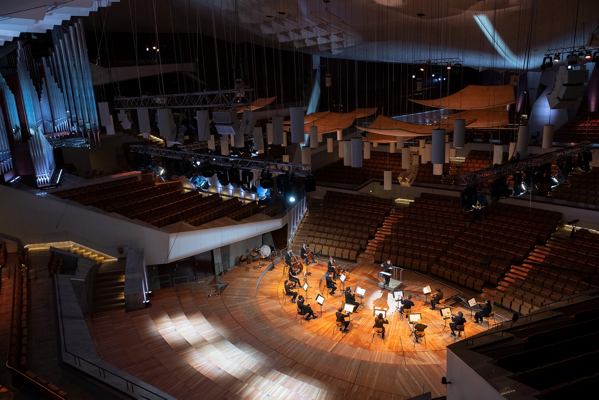 La situación de cuarentena global por el nuevo coronavirus ha obligado a las orquestas del mundo a suspender sus actividades presenciales y abiertas al público. En una primera etapa se ha hecho común la emisión de vídeos que muestran a los músicos orquestales tocando individualmente durante el confinamiento, y unidos a través del montaje audiovisual. La novedad fue presentada por la Filarmónica de Berlín a inicios de mes con la transmisión de un concierto de cámara con ejecutantes separados a distancia prudencial en una sala sin público. Mientras que la TfN-Philharmonie Hildesheim acaba de reunir a su elenco completo empleando para ello todo el espacio de su teatro.