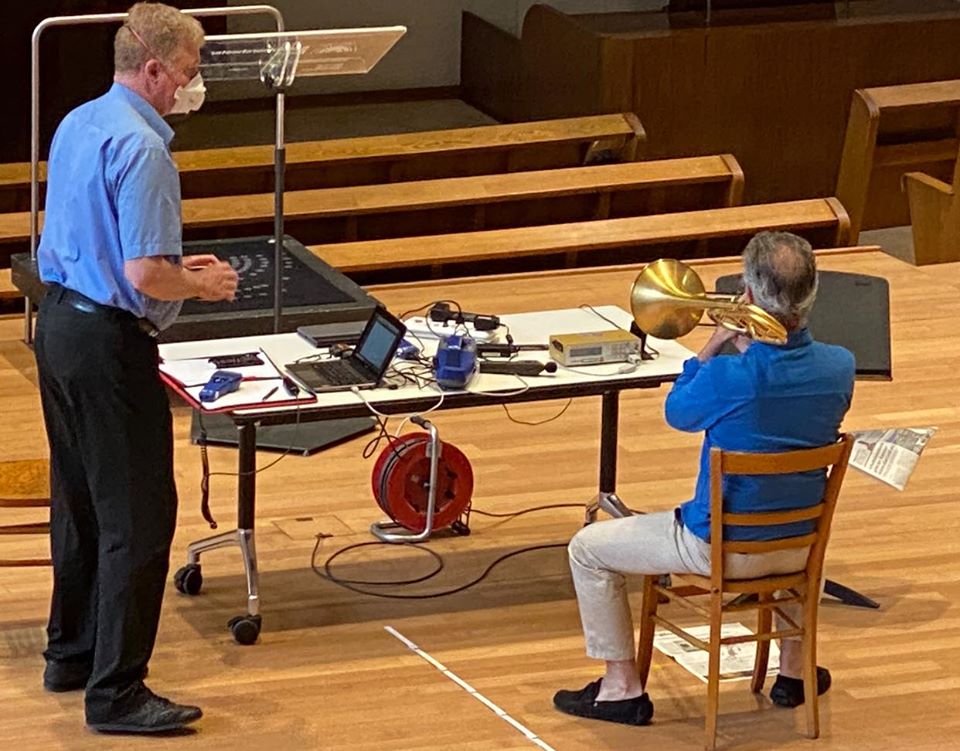 Músico de la Orquesta de la Tonhalle de Zurich en medición de la capacidad de propagación de aerosoles de instrumentos de metal. Proyecto conjunto con la Orquesta Sinfónica de Basilea.