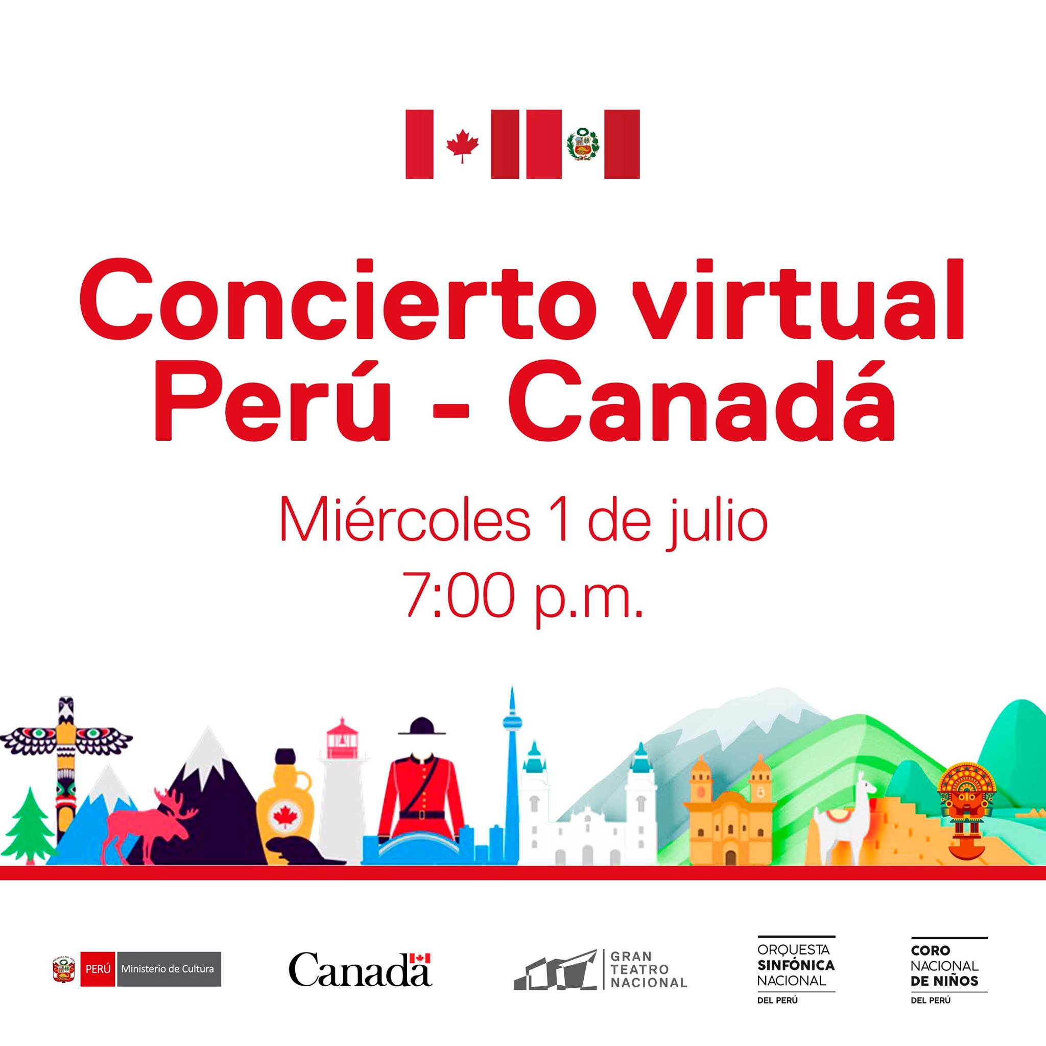 El 1 de julio se realizará la transmisión de un concierto virtual en homenaje a la amistad peruano-canadiense. Participan la Orquesta Sinfónica Nacional, el Coro Nacional de Niños, y la violinista canadiense Lara St John, todos bajo la dirección de Julian Kuerti.