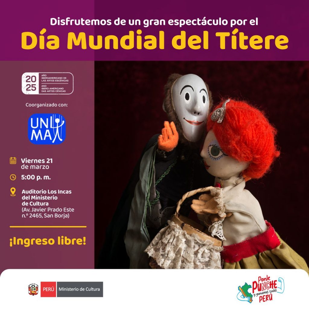 El Día del Títere es una festividad que se celebra internacionalmente el 21 de marzo. Es en el marco de esta celebración que el Ministerio de Cultura en coorganización con Union Internationale de la Marionnette-UNIMA Perú, a través de la Dirección de Artes, que busca promover la actividad titiritera y crear espacios donde se pueda difundir y disfrutar nuestra diversidad cultural, han realizado un evento que incluyó reconocimientos y presentaciones de varios de los principales exponentes del arte de los títeres en nuestro país.