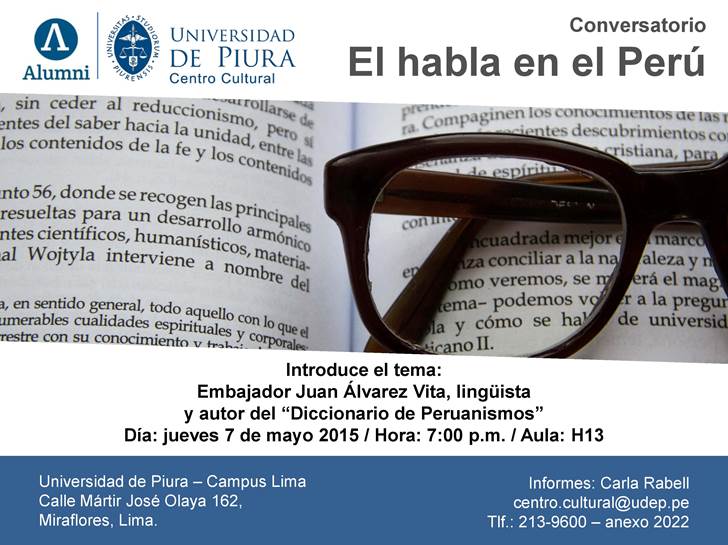 El Centro Cultural de la Universidad de Piura tiene el agrado de invitar a todo el público interesado en la linguística al conversatorio "El habla en el Perú". A cargo del embajador, lingüista y autor del Diccionario de Peruanismos Juan Álvarez Vita. Evento que se realizará este jueves 7 de mayo en el aula H13 del Campus Lima de la Universidad de Piura de 7 a 8.30 p.m.