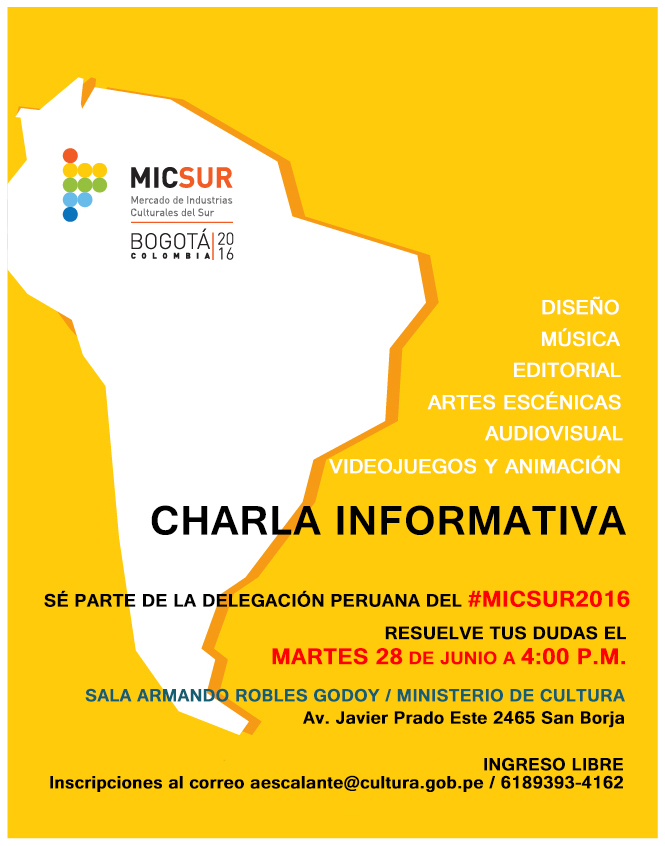 Se invita a los interesados a participar de la Charla Informativa sobre el Mercado de Industrias Culturales del Sur (MICSUR 2016), a realizarse el próximo martes 28 de junio, a las 4 p.m., en la Sala Armando Robles Godoy del Ministerio de Cultura. Durante la charla, se explicará la dinámica del mercado, las oportunidades que ofrece, y también se comentarán las bases de la convocatoria Perú, pudiendo absolver las consultas de los asistentes.