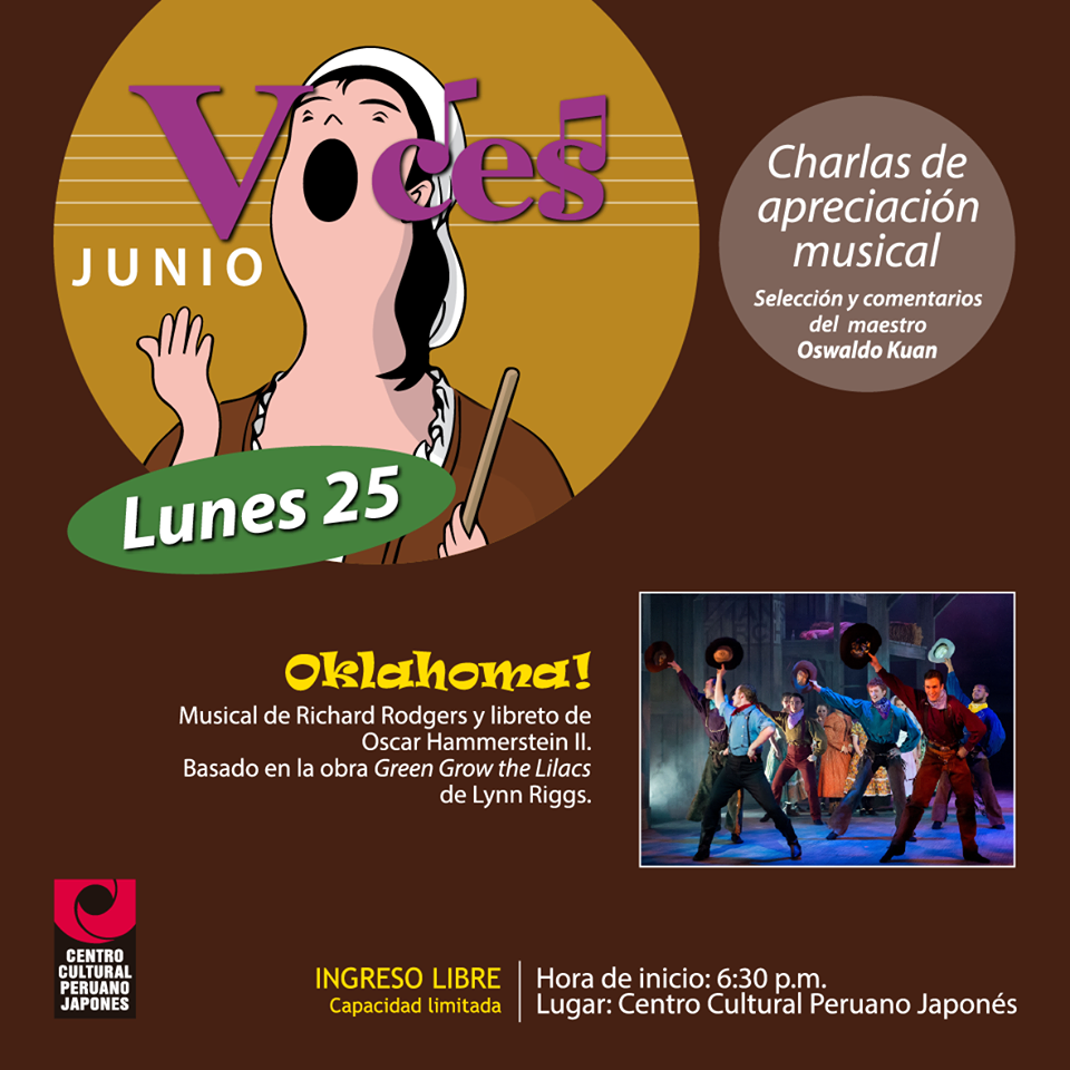 Este lunes 25 de junio continúa el Ciclo Voces: Oklahoma, de Richard Rodgers en el Centro Cultural Peruano Japonés, Av. Gregorio Escobedo 803, Jesús María.