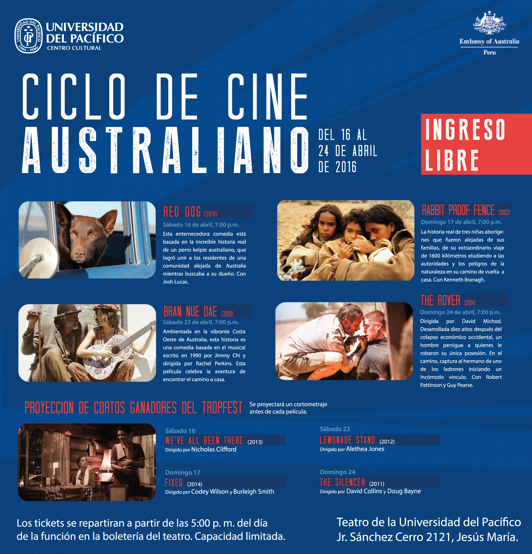 El Centro Cultural de la Universidad del Pacífico y la Embajada de Australia en Lima tienen el agrado de presentar el Ciclo de cine australiano, que se llevará a cabo en el Teatro de la Universidad del Pacífico del 16 al 24 de abril a las 7:00 p.m.