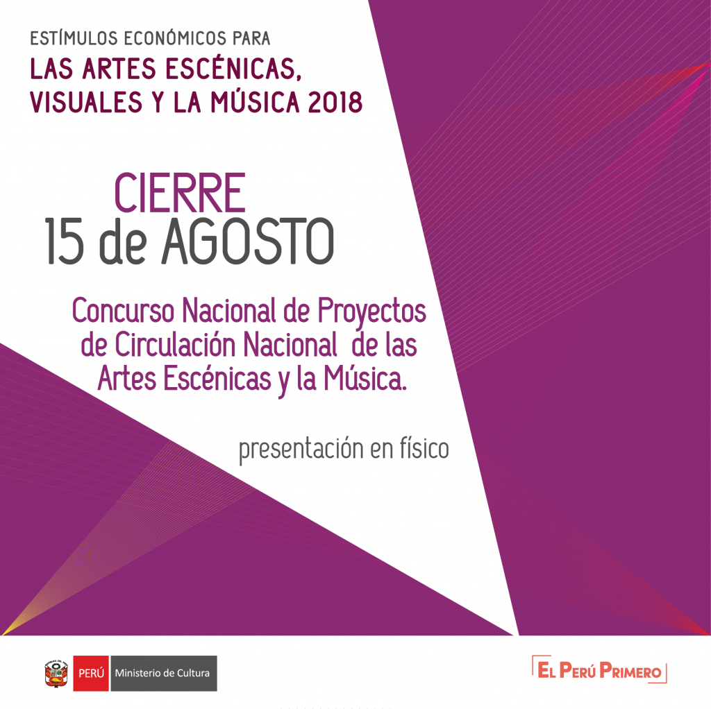 Reciba un cordial saludo. Queremos recordarle que la postulación al Concurso Nacional de Proyectos de Circulación Nacional de Artes Escénicas y la Música de la Primera Convocatoria de los Estímulos Económicos para las Artes Escénicas, Visuales y la Música 2018 cierra hoy a las 4:30 pm. Al ser esta una postulación en físico, se debe entregar en Mesa de Partes del Ministerio de Cultura o Dirección Desconcentrada de Cultura de cada región según su horario de atención. Asimismo comentarle que pasada la hora de atención no se aceptarán postulaciones.