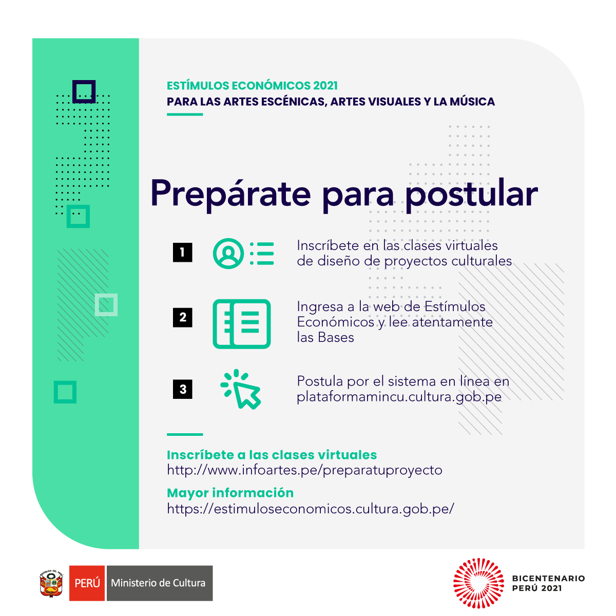 El taller tiene como objetivo brindar herramientas para que todas las personas y organizaciones interesadas puedan diseñar sus propios proyectos que serán postulados a los Estímulos Económicos para las Artes Escénicas, Artes Visuales y la Música 2021.