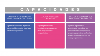 El estudiante usa los diversos lenguajes artísticos (artes visuales, música, danza, teatro, artes interdisciplinares y otros) para expresar o comunicar mensajes, ideas y sentimientos. Pone en práctica habilidades imaginativas, creativas y reflexivas para generar ideas, planificar, concretar propuestas y evaluarlas de manera continua, para lo cual hace uso de recursos y conocimientos que ha desarrollado en su interacción con el entorno, con manifestaciones artístico-culturales diversas y con los diversos lenguajes artísticos. Experimenta, investiga y aplica los diferentes materiales, técnicas y elementos del arte con una intención específica. Así mismo, reflexiona sobre sus procesos y creaciones y los socializa con otros, con el fin de seguir desarrollando sus capacidades críticas y creativas. Esta competencia implica la combinación de las siguientes capacidades: