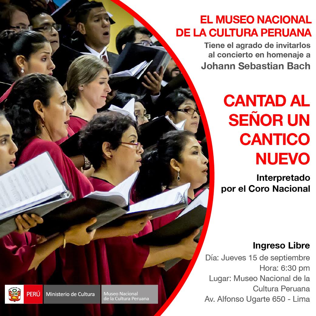 El Museo Nacional de la Cultura Peruana nos invita al concierto en homenaje a la obra del músico y compositor alemán Johann Sebastián Bach: (1685 – 1750), que cuenta con la interpretación del Coro Nacional del Perú. La cita es a partir de las 6:30 p.m. en sus instalaciones de Museo.