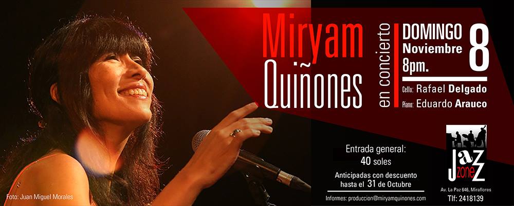 La cantora peruana Miryam Quiñones vuelve a los escenarios limeños para ofrecer un concierto el domingo 8 de noviembre, en el Jazz Zone de Miraflores. Que nos deleitaran con interpretaciones de temas latinoamericanos contemporáneos.