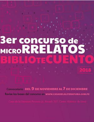 Ya está abierta la convocatoria del Tercer Concurso de Microrrelatos Bibliotecuento 2018, organizado por la Biblioteca Mario Vargas Llosa de la Casa de la Literatura Peruana. Pueden participar en este concurso peruanos o extranjeros a partir de 16 años que residan en el territorio nacional. Los microrrelatos tendrán una extensión máxima de 150 palabras.