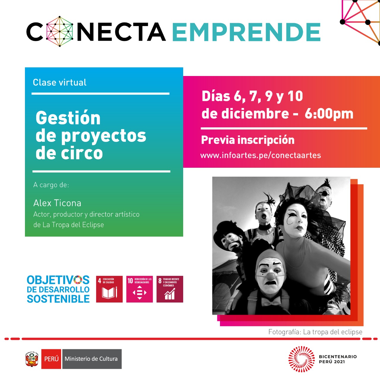 Curso teórico práctico que busca ofrecer herramientas para gestionar proyectos de artes circenses; analizando las posibilidades de sostenibilidad de los mismos. Se partirá de ejemplos y ejercicios prácticos para revisar conceptos básicos de producción y gestión, motivando en los participantes la reflexión sobre la importancia de la profesionalización del trabajo cultural.