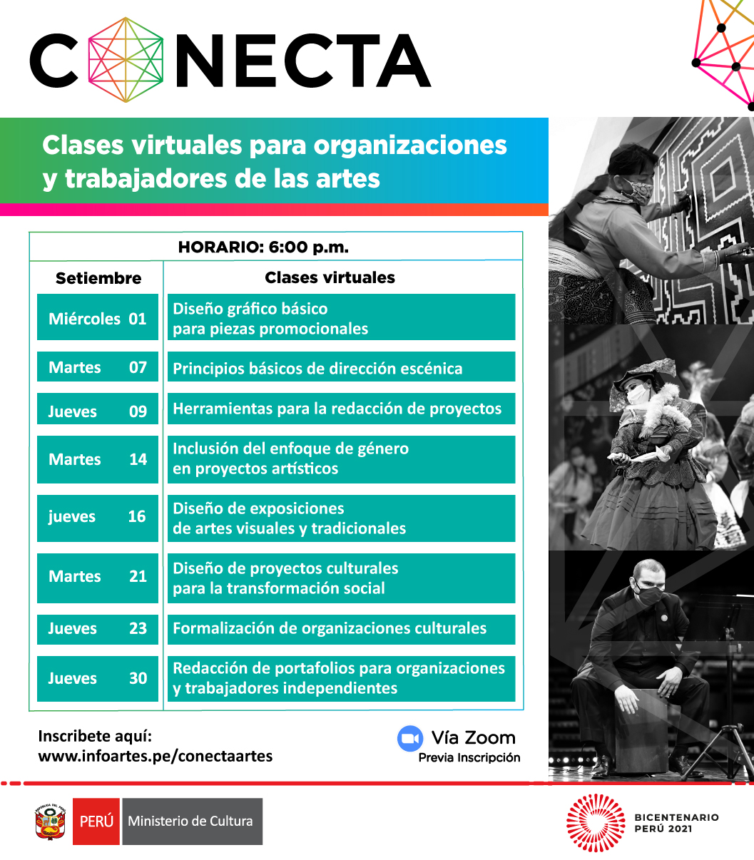 En el mes de setiembre, la Dirección de Artes del Ministerio de Cultura, en el marco de la iniciativa CONECTA, pone a disposición un nuevo ciclo de clases dirigidas a artistas independientes, colectivos y organizaciones a nivel nacional con conocimientos nulos o básicos en los temas propuestos.