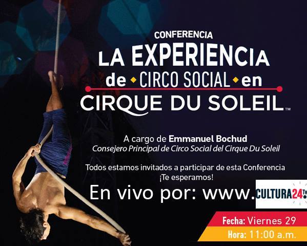 Este viernes 29 de agosto, desde las 11:00 am, a través de www.cultura24.tv se transmitirá vivo la Conferencia: La experiencia de Circo Social en CIRQUE DU SOLEIL a cargo de Enmanuel Bochud.