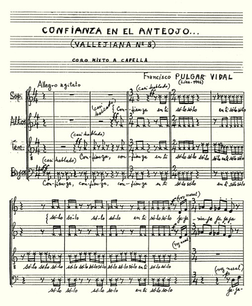 Fragmento de una de las dos “Vallejianas” para coro mixto escritas por Pulgar Vidal.