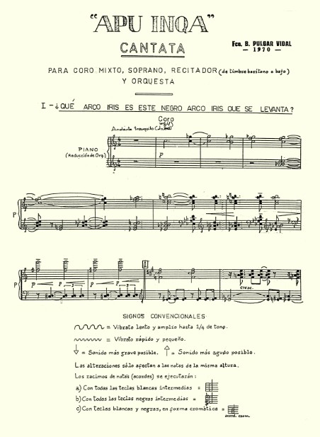 También tengo que decir algo particular en relación a su música vocal. Los músicos del período de los años cincuenta o sesenta, al hacer uso de técnicas como el dodecafonismo, la música aleatoria o las técnicas de la armonía extendida, encontraban grandes dificultades para escribir música vocal, especialmente para escribir música “cantable”, que los cantantes o los coros pudieran abordar con familiaridad o fluidez. Éste no es el caso de Pulgar Vidal, quien ha formado también parte de esa generación que se afilió abiertamente a la vanguardia, aunque fue precisamente el menos vanguardista de ellos. Recuerdo que aún era estudiante cuando hicimos algunas de las Once piezas corales, ese cuadernito que recoge canciones tradicionales peruanas a las que dotó de un tratamiento armónico que evoca mucho el mundo rural andino. Están ahí la “Vizcacha”, el “Cilulo” que es el carnaval de Cajamarca, entre otras, y nunca tuvimos dificultades para cantar esas piezas. Yo personalmente me enamoré de los Tres poemas líricos; creo que es una de las obras más importantes de la música coral peruana y que se trata de un feliz encuentro entre modernidad y tradición. Varios pasajes están trabajados modalmente más que tonalmente, y hay una gran dulzura en todas estas canciones que reflejan esa ternura de las canciones andinas cuyos textos, si bien él los traducidos, fueron originalmente concebidos en quechua.