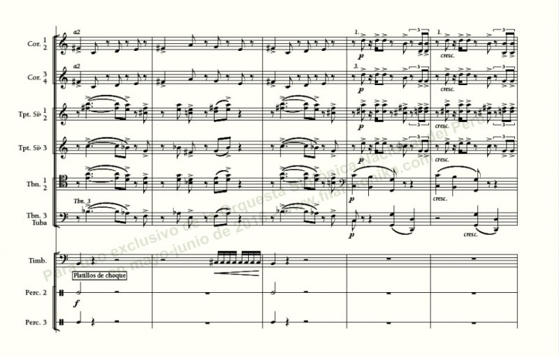 F.V: Y es notable la elaboración de motivos y células rítmicas, pero más importante aún el resultado general, manifestado sustancialmente en la gran fuerza expresiva de la obra. No sé hasta qué punto ya se habría escrito algo así en nuestro medio, con esa fuerza y contemporaneidad. Es un rasgo general en su música, en donde, como usted ha dicho, tradición y modernidad están siempre presentes.