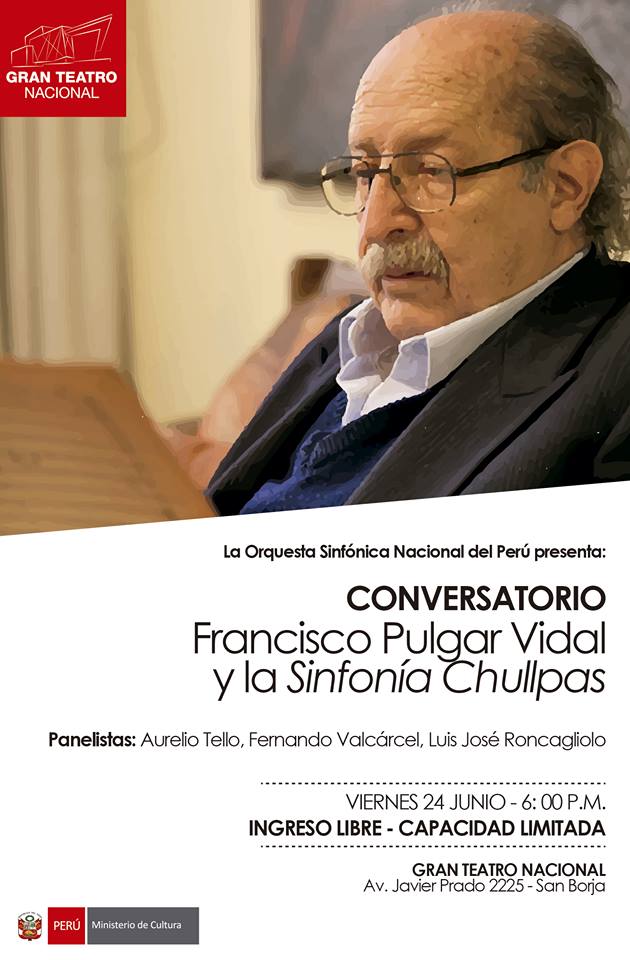 Conversatorio realizado en la antesala a la interpretación de “Chulpas”, Sinfonía Nro. 1 de Francisco Pulgar Vidal, en el marco del “Festival Francisco Pulgar Vidal” con el que la Sinfónica Nacional rinde homenaje al compositor el presente año. Participaron Aurelio Tello (musicólogo, compositor y director) como invitado, y por parte de la OSN: Fernando Valcárcel (Director titular) como moderador y Luis José Roncagliolo (Archivero-Copista). La presente transcripción se presenta a modo de entrevista entre Fernando Valcárcel y Aurelio Tello. Las intervenciones de Luis Roncagliolo, realizadas en base a las notas al programa escritas por él para aquel concierto, se han vinculado mediante hiperenlaces a la entrada del presente número del Boletín que contiene el íntegro de dichas notas.