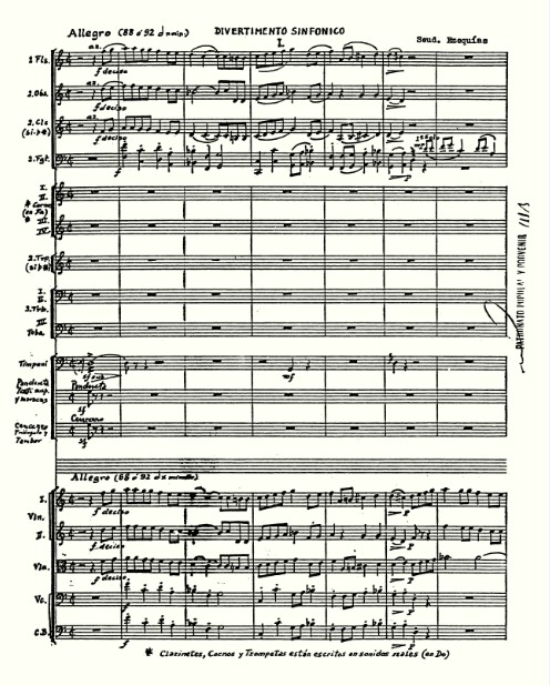 Primeros compases de la Sinfonía Nro. 2 “Barroco Criollo”, cuando aún llevaba el título de “Divertimento Sinfónico”. Aparece esta partitura firmada bajo un seudónimo (“Ezequías”) con el postuló al Concurso de Composición Sinfónica convocado por el Patronato Popular y Porvenir Pro Música Clásica en 1981, obteniendo el segundo premio [Foto: Archivo OSN]