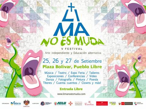 LIMA NO ES MUDA es un festival de arte independiente y educación alternativa que llega a su quinta edición. Este año se desarrollará del 25 al 27 de setiembre en la histórica Plaza Simón Bolívar de Pueblo Libre. Las inscripciones están abiertas para los interesados en participar con propuestas artísticas, educativas y también como expositores de la Expo Feria de emprendedores.