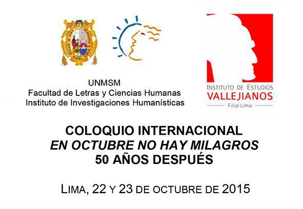 El Instituto de Investigaciones Humanísticas de la Facultad de Letras y Ciencias Humanas de la Universidad Nacional Mayor de San Marcos y el Instituto de Estudios Vallejianos, convocan a la comunidad académica a presentar ponencias para el Coloquio Internacional En octubre no hay milagros: 50 años después. El certamen académico propone como marco general, el debate sobre la novela que en el presente año cumple cincuenta años de publicada.