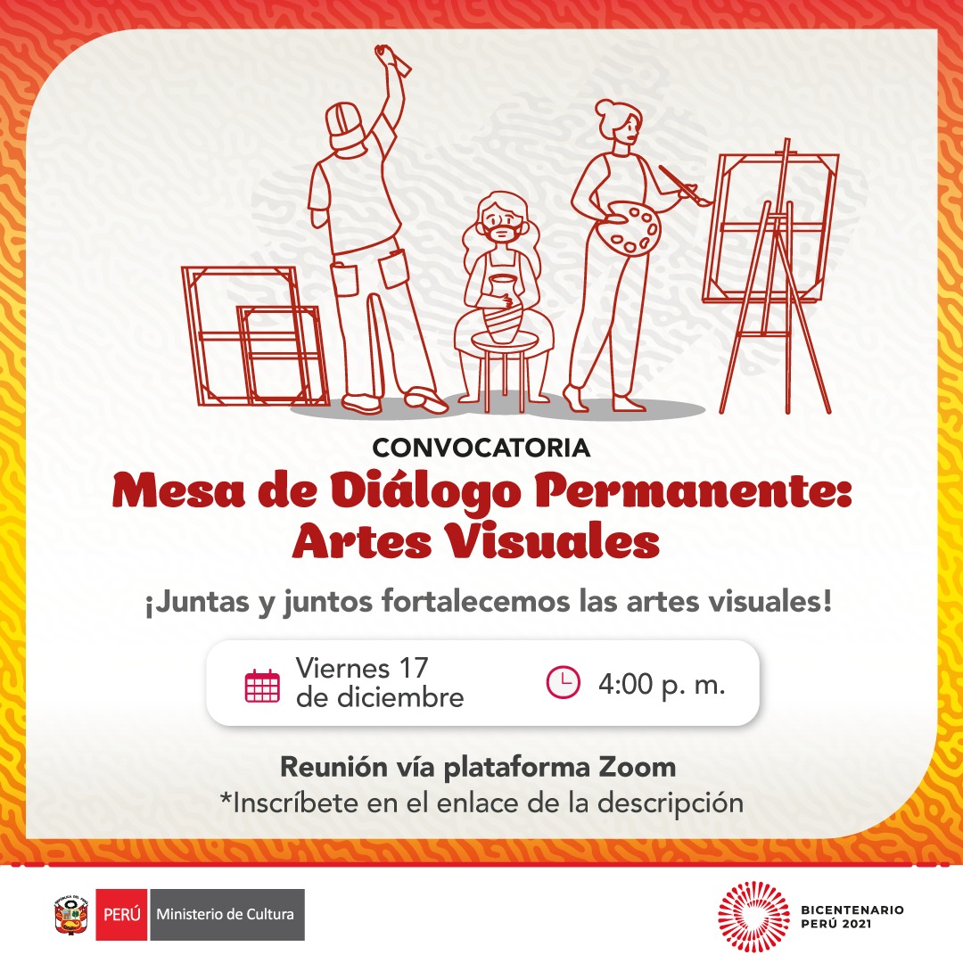 La Dirección de Artes, órgano de línea de la Dirección General de Industrias Culturales y Artes del Ministerio de Cultura del Perú, convoca a asociaciones o colectivos, redes y plataformas de las artes visuales a participar de la segunda reunión de la  Mesa de Diálogo Permanente que se llevará acabo el viernes 17 de diciembre del 2021 a las 4:00 p.m. vía plataforma Zoom.