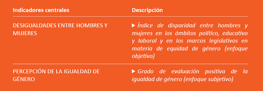La igualdad de género no sólo está reconocida internacionalmente como pilar del desarrollo sostenible, la igualdad de género puede ir de la mano con el respeto a la diversidad cultural y los derechos culturales cuando está integrada dentro de un marco de derechos humanos que favorezca la inclusión y la igualdad de acceso a derechos y oportunidades. Las políticas específicas e intervenciones en favor de la igualdad de género influyen fuertemente en las actitudes y percepciones de los roles de género y mejoran los niveles de igualdad de género en la práctica. Por otra parte, las actitudes y percepciones culturales desempeñan un papel fundamental en la orientación de dichas políticas y medidas. Sin embargo, las políticas requieren personas: tienen que ser apoyadas por miembros de la comunidad para que sean exitosas y sostenibles. La Dimensión Igualdad de Género examina por un lado las correlaciones o las brechas existentes entre la promoción y la valorización de la igualdad de género a través de políticas y acciones concretas, y por otro las percepciones de la igualdad de género.