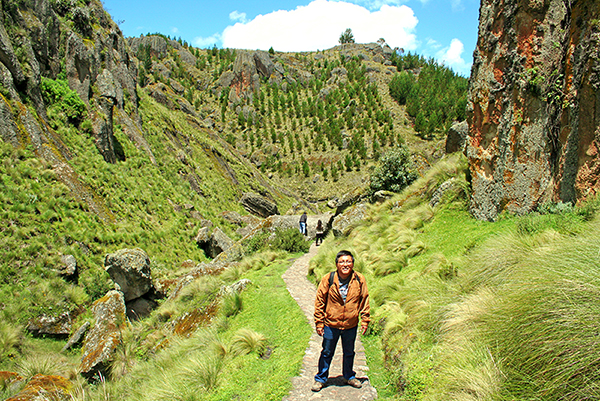 La foto N°5 de título "Caminando por los monjes de roca", en esta foto esta mi esposo, representando a todos los turísticas que realizando trekking recorren todo el camino de formaciones rocosas, como se aprecia hay abundante vegetación, en el camino los turíaticas encuentran comidas como chicharrones, tamales, humitas, algunas paisanas vendiendo unos cinturones tejidos por ellos mismos, y por supuesto algunas niñas vendiendo agua