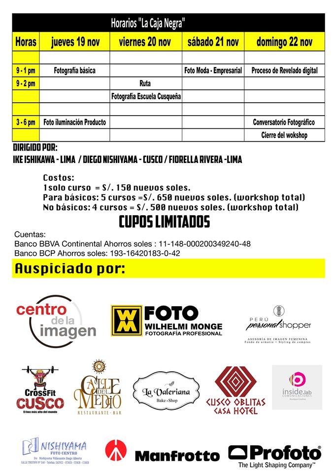 La Mácula Productora Visual anuncia el inicio en Cusco del taller fotográfico La Caja Negra que van del  jueves 19 al domingo 22 de noviembre del 2015.  Los cursos se pueden tomar de manera individual o de manera integral con un precio especial por todo el taller.