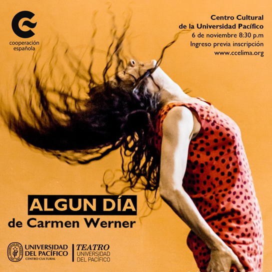 La coreógrafa española Carmen Werner presentará el espectáculo “Algún día” el viernes 6 de noviembre a las 8:30 p.m. en el Teatro del Centro Cultural de la Universidad del Pacífico (Jr. Sánchez Cerro 2121, Jesús María). En esta obra, Carmen Werner y Alejandro Morata dan vida a una pareja cuyo presente se quiebra por la falta de comunicación. La llegada de Carmen Werner es posible gracias a la Agencia Española Cooperación Internacional y a la Embajada de España, mientras que el espectáculo es posible gracias al apoyo del Centro Cultural de la Universidad del Pacífico.
