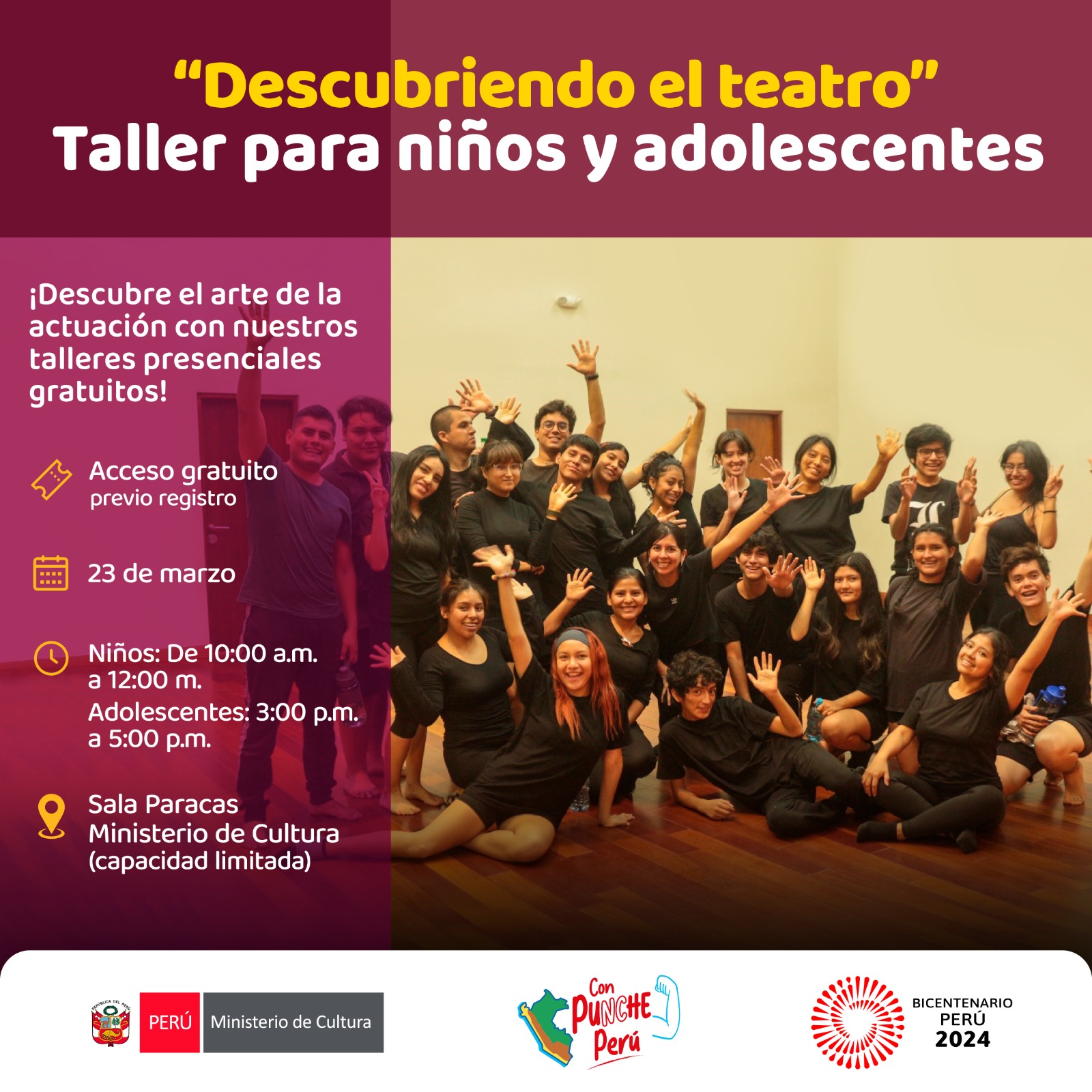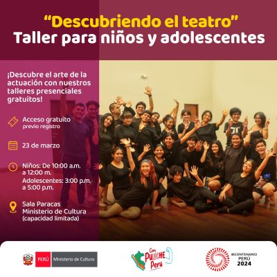 En el marco del Día Mundial del Teatro les invitamos a Sumergirse en el fascinante universo de la actuación y despierta tu creatividad e imaginación. Este taller (masterclass) ofrece a niños y adolescentes la oportunidad de explorar las herramientas fundamentales del arte escénico a través de dinámicos ejercicios que potencian la expresión corporal y vocal. Desde el Ministerio de Cultura, te extendemos una cordial invitación a participar en nuestros talleres gratuitos.