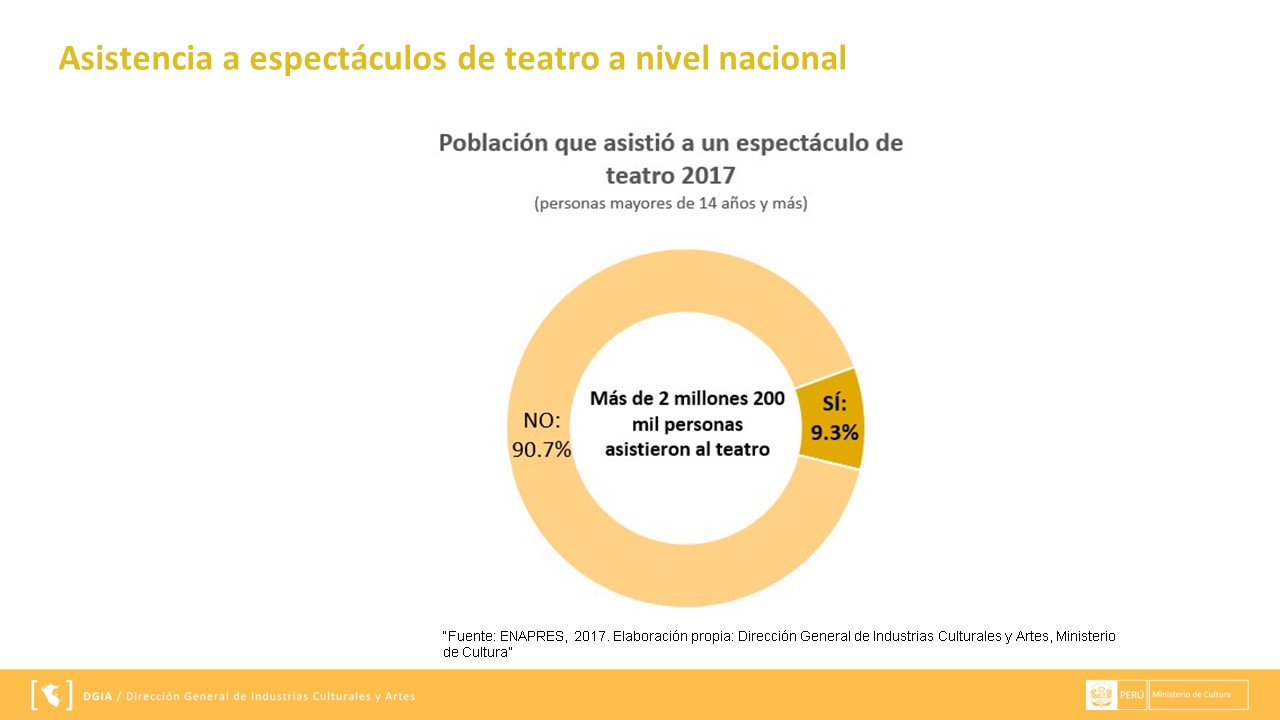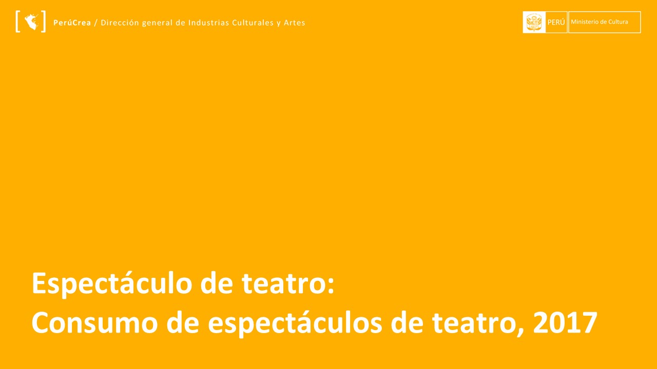 Presentamos la información respecto al Estado del consumo de las artes escénicas en el Perú, 2017-Teatro, la cual se expuso en la Segunda Mesa de Industrias Culturales a cargo de la Dirección General de Industrias Culturales y Artes (DGIA) en noviembre del 2018.