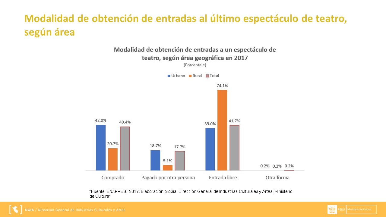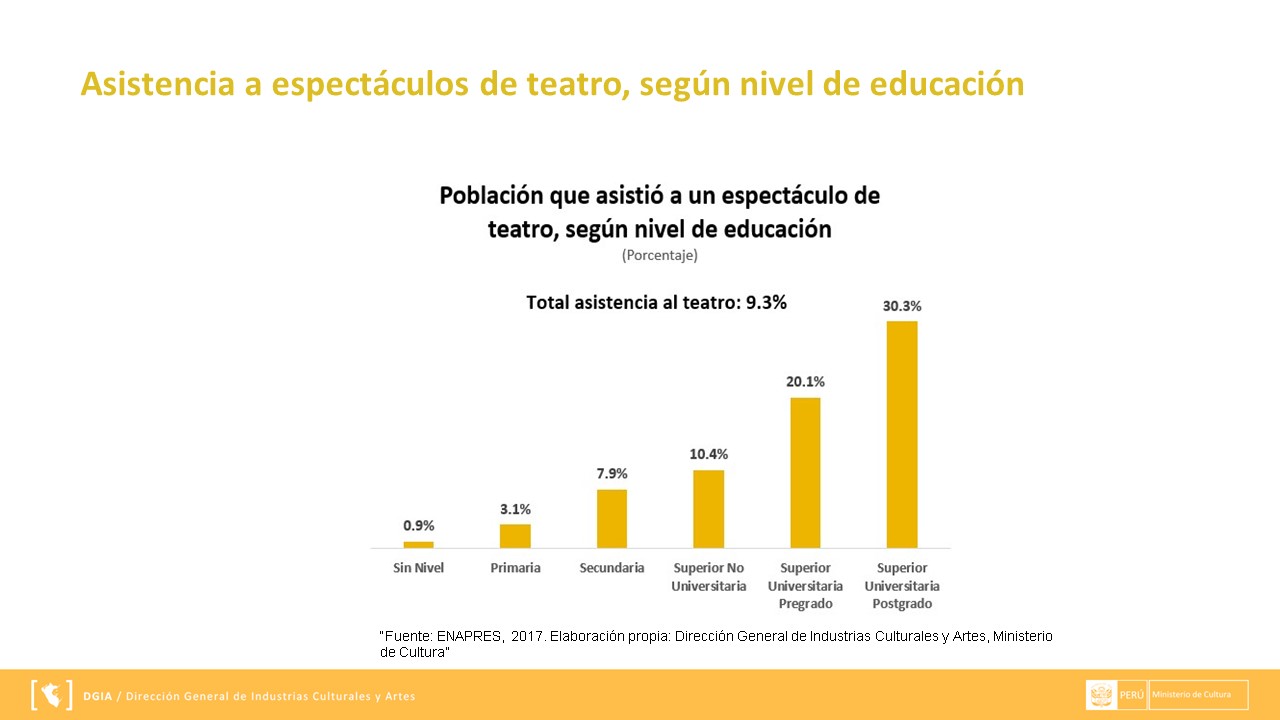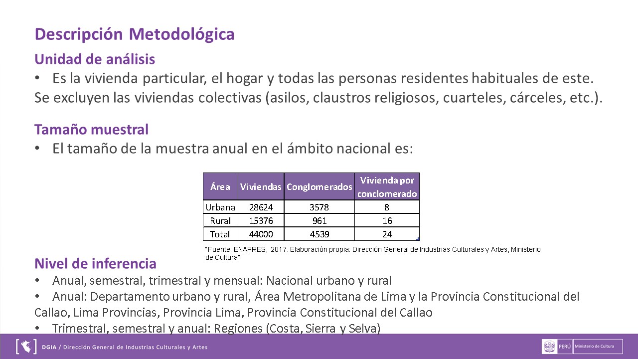 La información presentada se extrae a través de ENAPRES (Encuesta Nacional de Programas Estratégicos) y los reportes que se muestran a continuación han sido preparados por el área de Gestión de Información de la Dirección General de Industrias Culturales y Artes. Puedes descargarla en el siguiente enlace DMT.