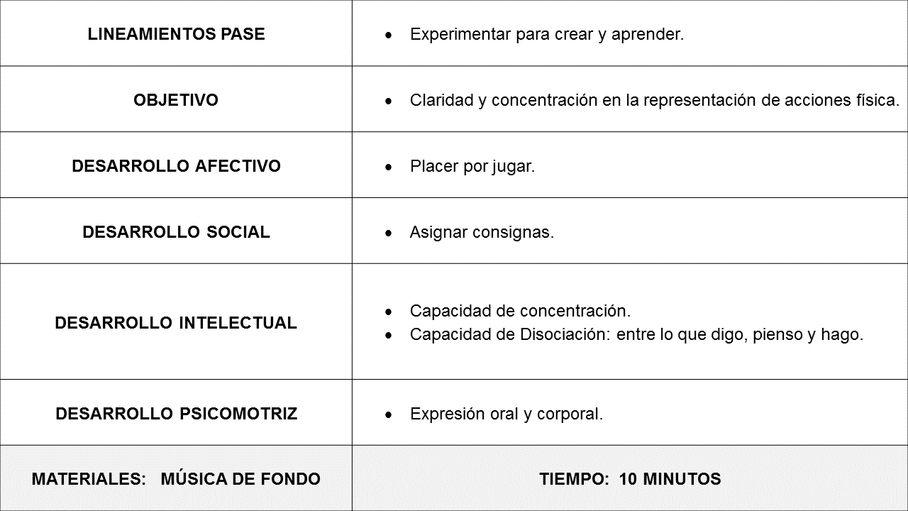 • Uno propone una actividad concreta por ejemplo: Peinarse, cuando su compañero le pregunta: ¿Qué haces? Este deberá responder que realiza una actividad distinta a la que viene ejecutando. El participante que preguntó realiza la actividad indicada. Y el juego se realiza una y otra vez.