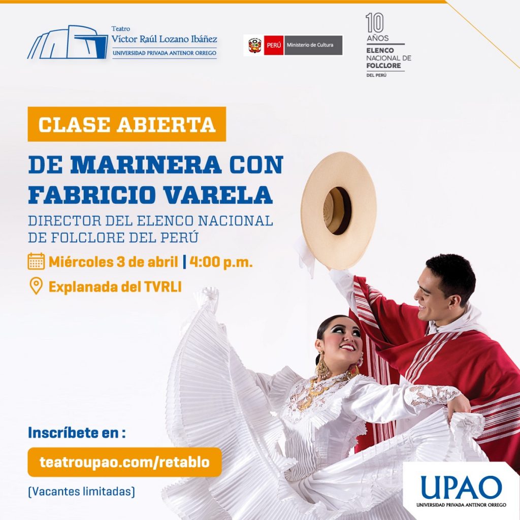 Además, el maestro Fabricio Varela, actual director del Elenco Nacional de Folclore del Perú y campeón de diversas ediciones del concurso nacional de marinera del Club Libertad de Trujillo, brindará una clase abierta gratuita de marinera el miércoles 3 de abril a las 4:30 p.m. en la explanada del Teatro Víctor Raúl Lozano Ibáñez como parte de sus actividades de formación de nuevos públicos.
